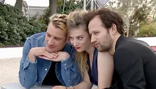 | Fooling around for the Cannes photographers in 2024, from left: Pierre Cottin, Sarah Suco and Benjamin Lavernhe at the premiere of The Marching Band Photo: Courtesy of Cannes Film Festival |