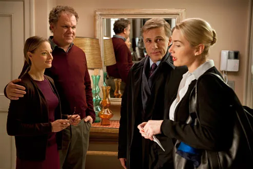 Winslet, who plays investment broker Nancy, looks well put together, all red, white, and blue (lipstick, blouse, and silk scarf, respectively) and is soon falling apart quite differently from Foster's character. You won't be able to look at a baking dish and not think of her performance for a while. Winslet explained in an interview how much she enjoyed the luxury of having a two-week long rehearsal period: "But I don't think any of us could have predicted that Roman had us all learn the entire script, from start to finish, like a play."