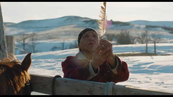 It is, of course, an exaggerated account, a take on that historical fictionalisation of indigenous lives, which is quickly established as we move into the second segment. Though this is in colour, there is, for much of the time, less visual information onscreen, as it’s set at night and, in parts, during heavy snowfall. The interiors we glimpse are – aside from the unavoidable casino – muted, verging on grim, with their predominant blue-greys, and this informs a vision of Pine Ridge reservation which is enervated and lonely. We follow a police officer (Alaina Clifford, delivering a take on the job she does in real life) as she deals with one tragic incident after another, still with their roots in poverty and alcohol. Out on the road by herself, she seems sufficiently vulnerable that it’s not just the snow that will make you shiver, even after we’ve seen that she can handle herself. There’s a sense of danger here that goes beyond the human, beyond the merely physical.