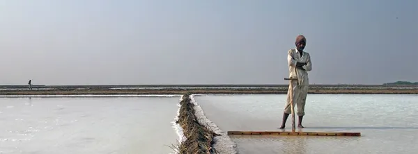 But most of the family's work is done by hand - or, more precisely, by foot. The rhythmic manner in which a line of family members slowly shuffle across a salt pan, treading down the sodden surface so as to pack the crystals tighter together, builds into a hypnotic sound resembling a percussive musical accompaniment - while the slow, repetitive movement develops into a kind of dance. These rhythms are also echoed in the domestic spaces, whether slapping clay onto the ground to create a smooth floor, or the patting of chapattis as dinner is being cooked.