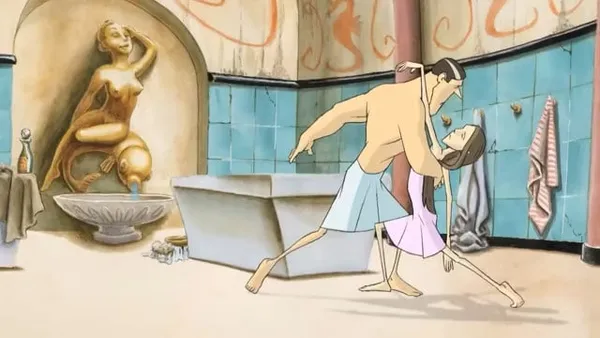 It might not seem that the tango belongs in a sauna, but Vera Lalyko's film suggests that it might. Beautifully animated, with crisp character design and a sumptous single background, it's visually splendid.