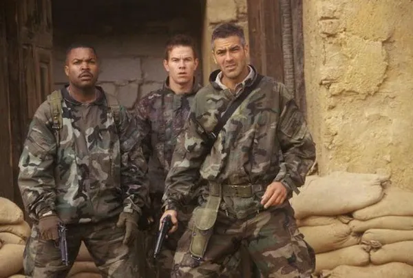 The conflict has just ended and these soldiers have neither fired a gun in anger, nor seen a man die. They get drunk, jump up and down, look happy for the news cameras - because that's what GIs do these days, perform for the media - while Major Archie Gates (George Clooney), two weeks away from retirement, is giving the lissom blonde TV reporter a quickie in the communications tent.
