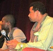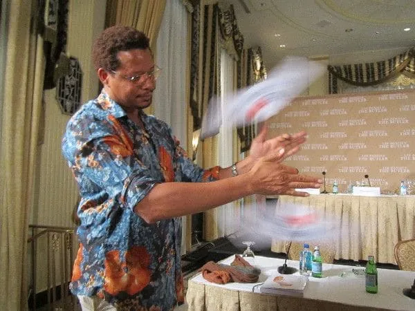 | Terrence Howard displays his coat hanger twirling skills at the Waldorf Astoria with The Butler screenwriter Danny Strong being interviewed in the background Photo: Anne-Katrin Titze |