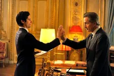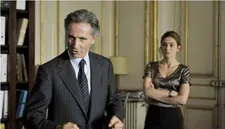 | Thierry Lhermitte as the French Minister with Julie Gayet as Valerie Dumontheil: "The things he picks from the books are really bizarre but it's part of his universe." |
