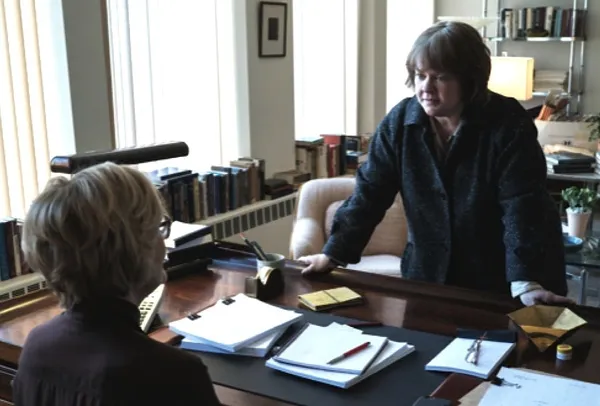 Dolly Wells on Lee Israel (Melissa McCarthy) with Marjorie (Jane Curtin) and a stolen coat: "She is very careful because she doesn't wear it when she goes to see her agent."
