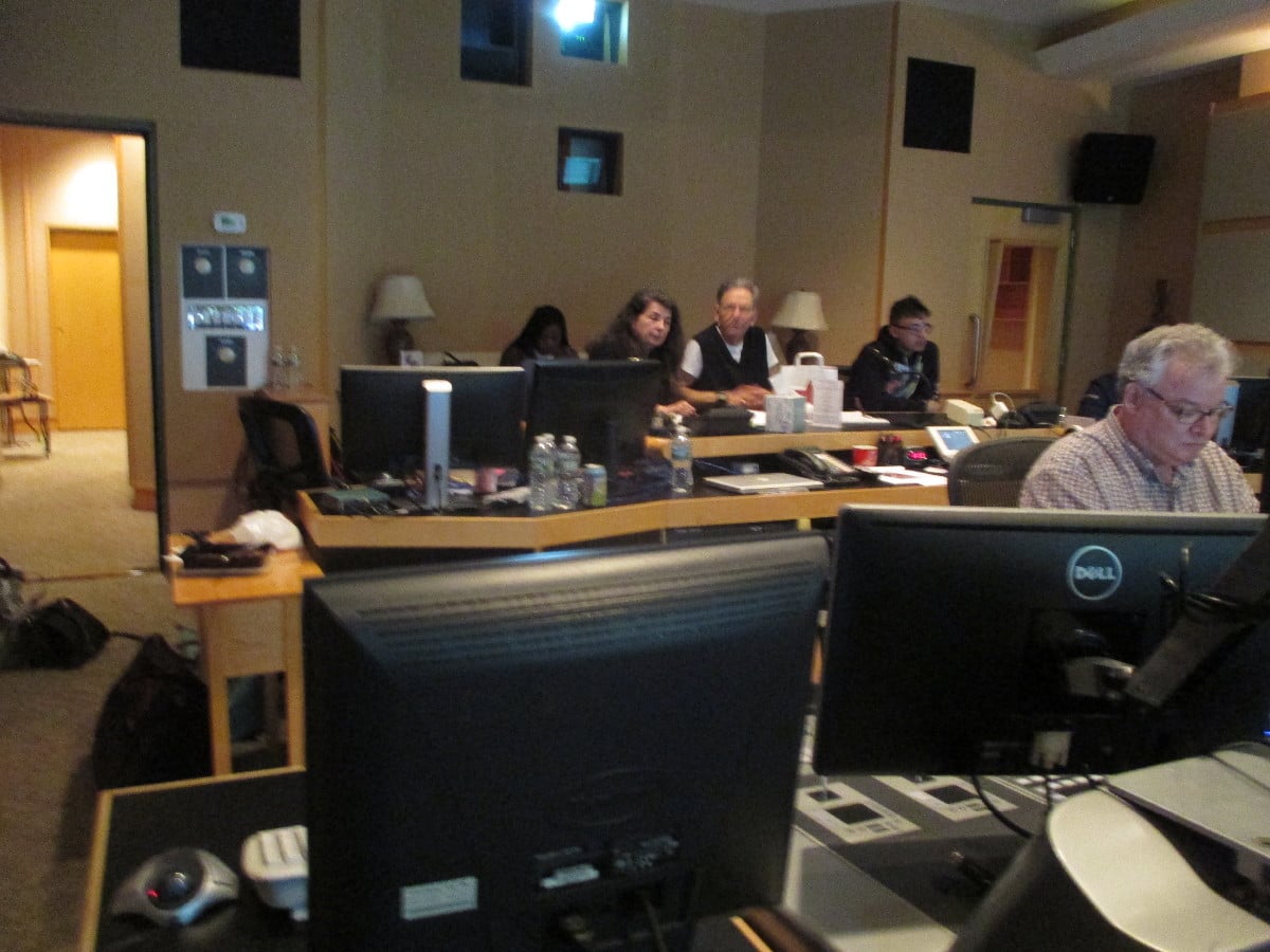Ira Spiegel with Aviva Kempner while re-recording mixer Tom Fleischman works on The Spy Behind Home Plate.