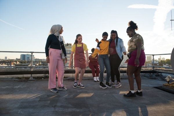 Bukky Bakray as Rocks (blue denim) with her crew in the film. Sarah Gavron: 'I had a whole support structure in terms of harnessing that energy but I definitely lost my voice more than I've ever lost my voice on a shoot before'