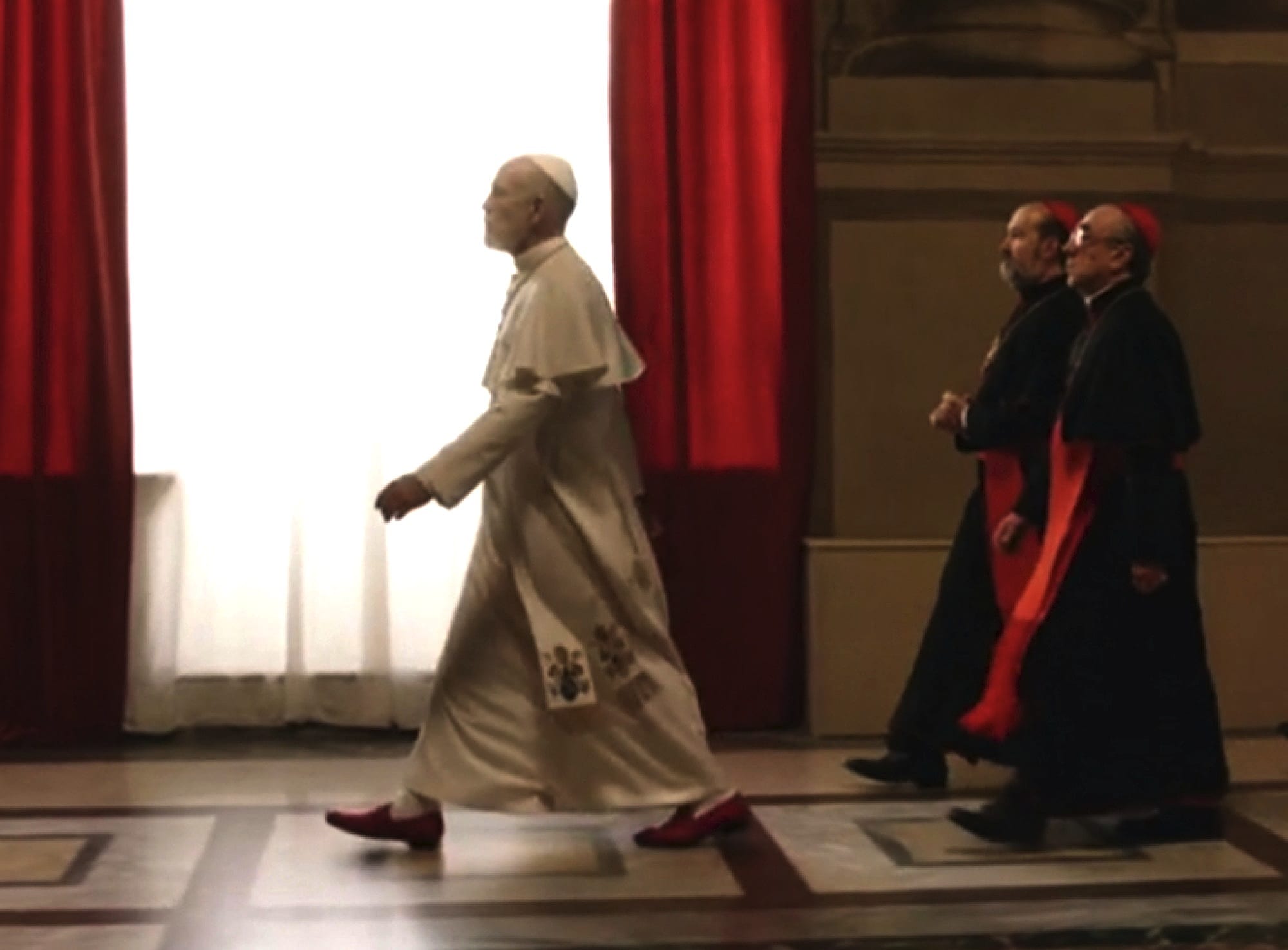 John Malkovich in the red shoes with Javier Cámara and Silvio Orlando in Paolo Sorrentino’s The New Pope