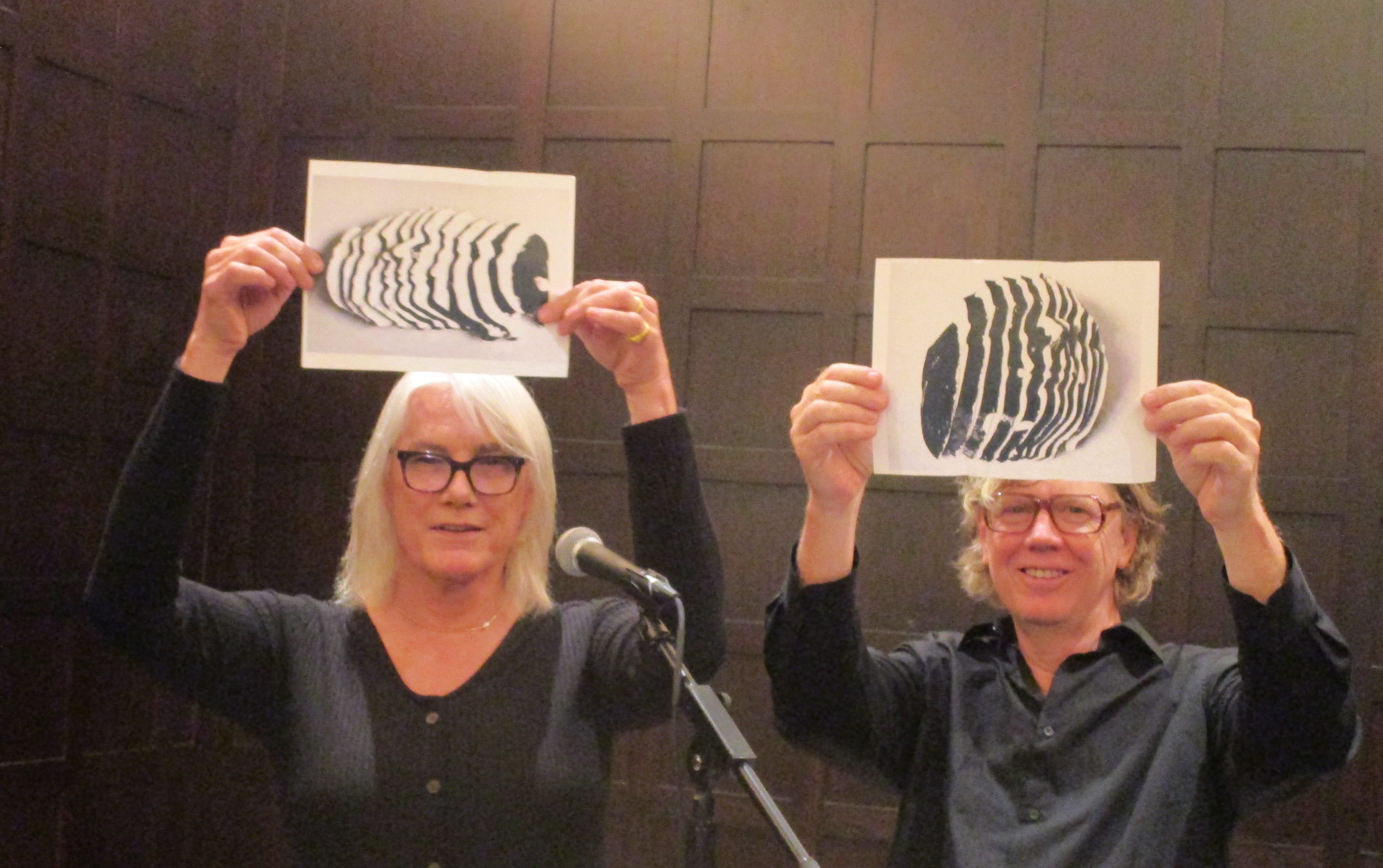 Jamie Nares and Thurston Moore holding up the hastily printed-out photos of the Harry Roskolenko chopped up death mask sculpture: “I called it The Poet Is A Book.”