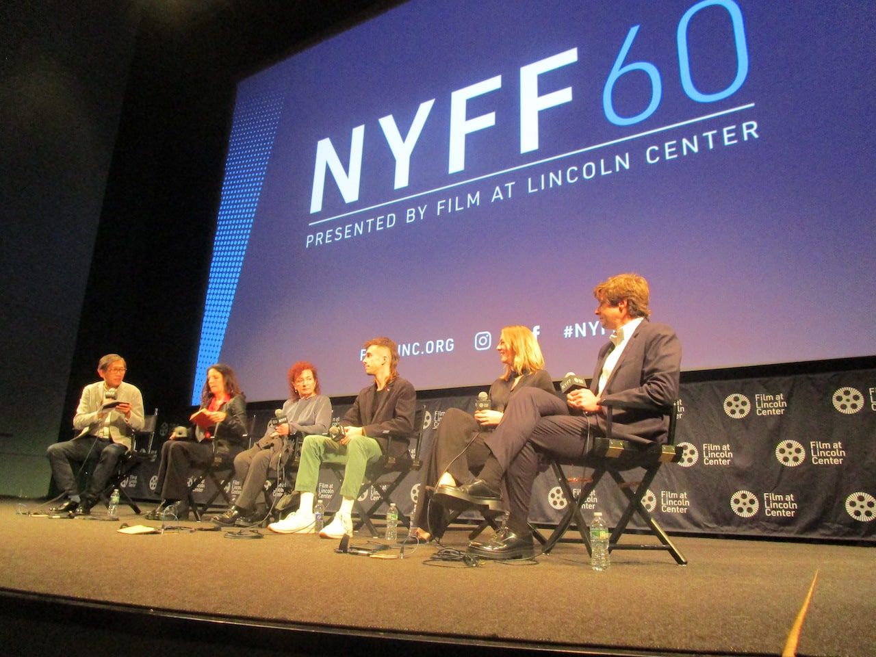 Dennis Lim with All the Beauty and the Bloodshed director Laura Poitras, P.A.I.N. activists Nan Goldin, Harry Cullen, Megan Kapler, and the organisation’s lawyer Mike Quinn