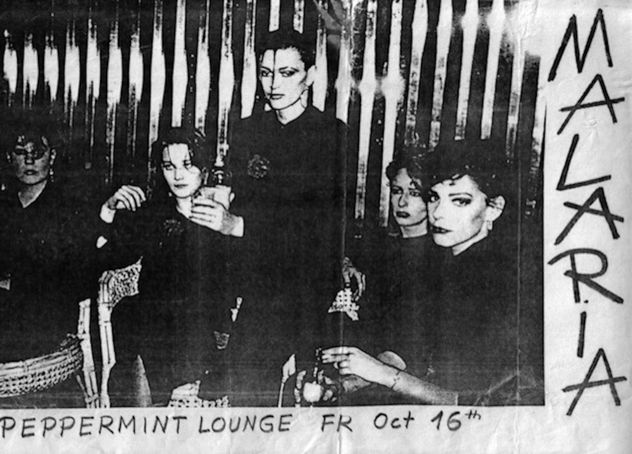 B-Movie: Lust & Sound in West-Berlin 1979-1989 featured band Malaria! (Manon P Duursma, Bettina Köster, Gudrun Gut, Christine Hahn, Susanne Kuhnke), photographed at Studio 54 for their 1981 Peppermint Lounge show