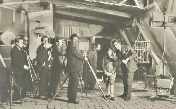 January 1925. First turn of the crank at the Boulogne studio. Abel Gance explains the filming set-up to the young Bonaparte (Vladimir Roudenko), surrounded by the technical crew