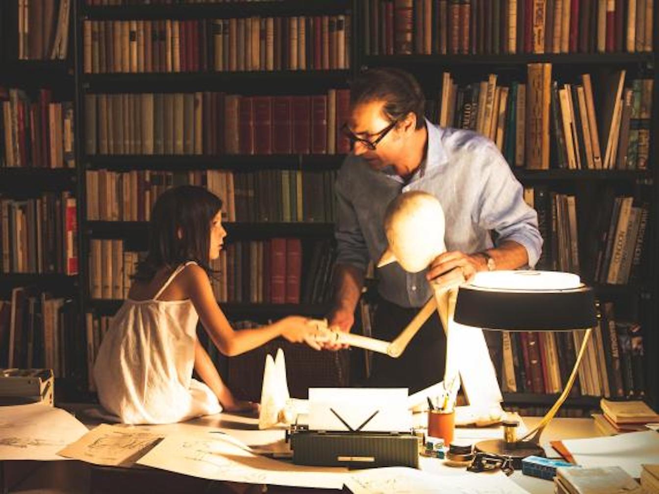 Fabrizio Gifuni as Luigi with Anna Mangiocavallo as his little daughter Francesca, discussing Pinocchio
