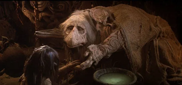 The titular crystal is part of a giant machine providing the Skeksis with power. It does so because it's broken; if the gelflings can restore its missing fragment in time, they might still save their world. The mystic notions behind all this might be looked on cynically by most adults, but don't seem to be a problem for the target audience. Everything is beautifully realised, from the carefully created sets (which blend surprisingly well with real landscapes) to the sound work and the filtered lighting that gives the whole thing an enchanted cast.
