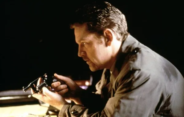 One night he becomes involved with a waitress (Embeth Davidtz), who, quite cleverly, seduces him. Perhaps "seduce" is too sophisticated a word. He drives her home - it's blowing a hurricane - and she invites him in. It appears someone has been there first. While he searches for the intruder, she takes her kit off. As well as a firm, lean body, Magruder discovers she has a story to tell. Her daddy's deranged and stalks her. She's scared to be alone.