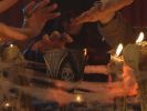 Part epic tale of desperation and doom, part buddy comedy, the film follows Tonho and the sword (which is voiced by João Loy and loving sculptured in latex to look like D&D monster), as they try to come up with a plan. Training is suggested and you might hope for a classic martial arts cinema montage, but Tonho is palpably not up to that. He also does a good job of offending the spirit of the forest when they go looking for allies, but does manage to impress a strange woman in glowing white clothes. She’s not Galadriel, honest, but she gives him the power of light in dark places all the same. He’s going to need everything he can get, because whilst all this is going on, a ground of hooded figures huddled round a table that’s crowded with candles discuss the breaking of the barrier and determine to eliminate the person responsible before it’s too late.