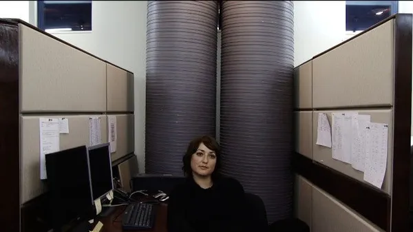 The cubicles are in strange places. They have stairs, they have vents, the spaces depicted are amazing - more so when we get secondary shots of them at the end, people in their working environments. We learn the jobs of the motivational speaker, of the architect involved in the birth of systems furniture, can see the work of those who assemble cubicles, hand-smoothing something like felt onto something like a wall. We know one of them "puts points on things", scoots her chair over for meetings. In one office a photocopier looms over a sleeping dinosaur.